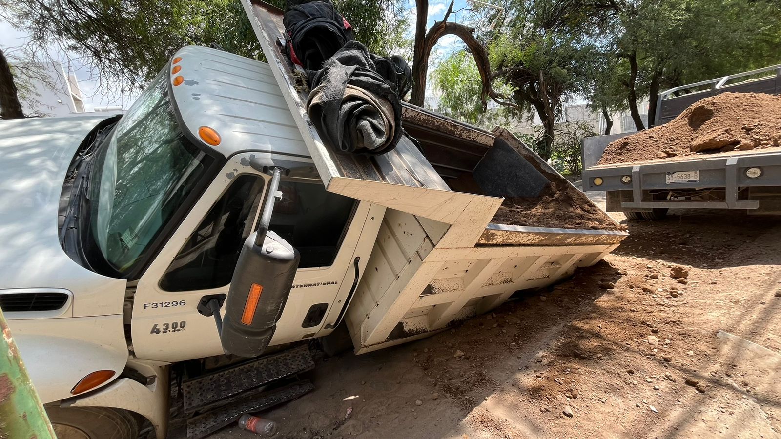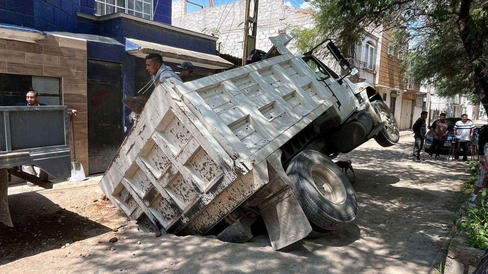 Los hechos ocurrieron cuando el camión circulaba sobre la calle Arboleda. En el trayecto, repentinamente se hundió el pavimento y la pesada unidad cayó en un socavón. Abajo del pavimento ya estaba hueco, al parecer debido a una fuga de agua o de drenaje.