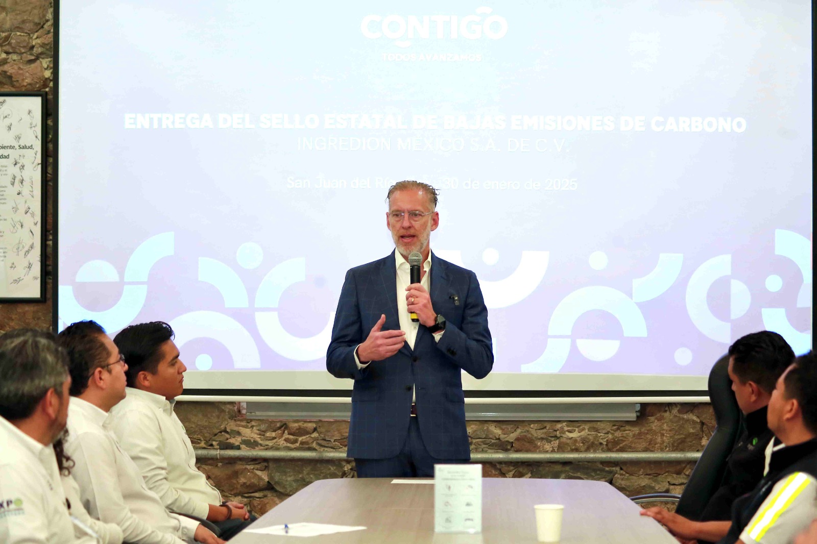 El titular de la Secretaría de Desarrollo Sustentable (SEDESU), Marco Antonio Del Prete Tercero, entregó tres Sellos de Bajas Emisiones de Carbono a la empresa Ingredion en San Juan del Río, por su contribución a la reducción de CO2 y ahorro de energía en sus procesos.