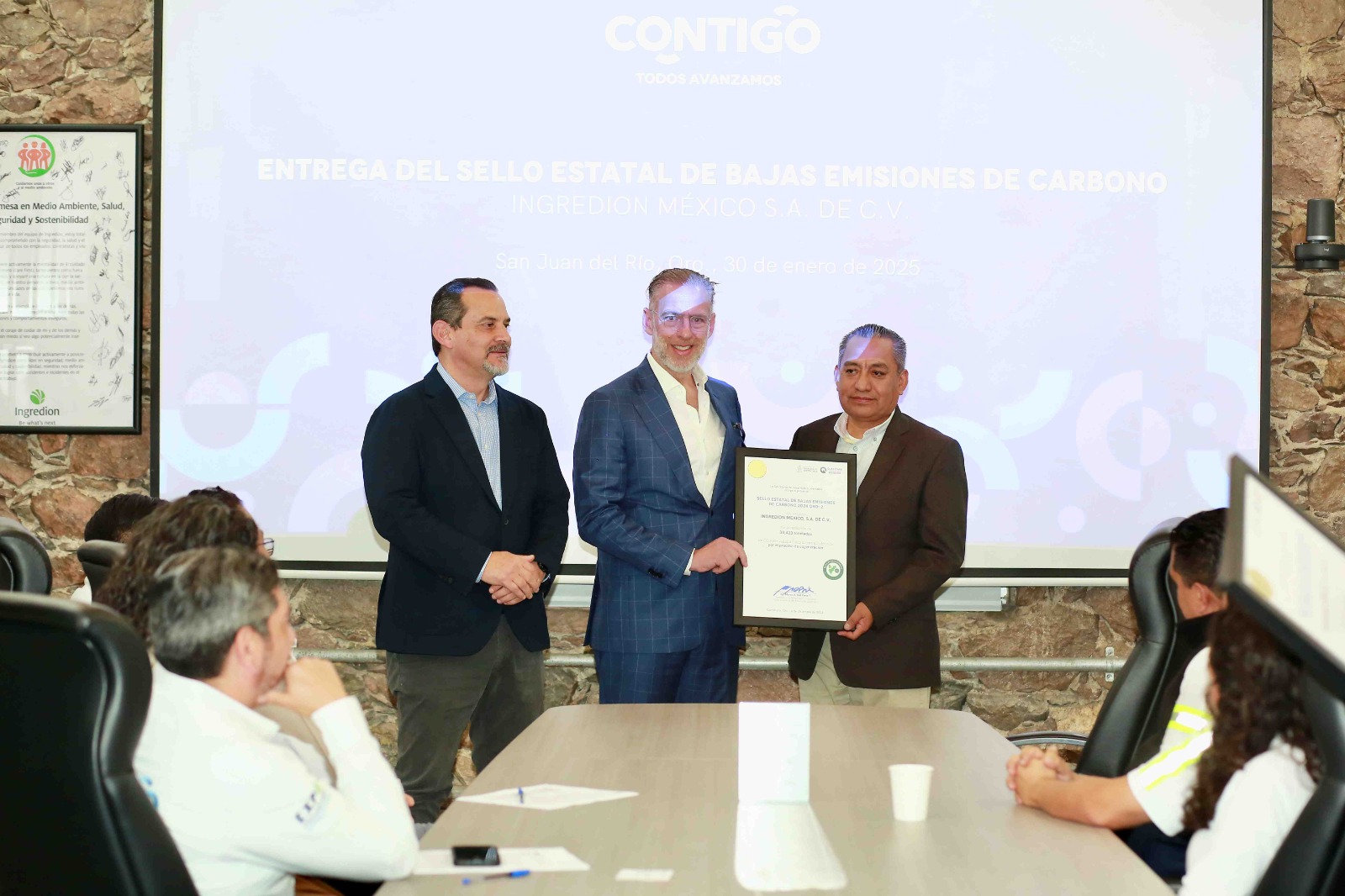Entregan tres sellos de Bajas Emisiones de Carbono a la empresa Ingredion en San Juan del Río