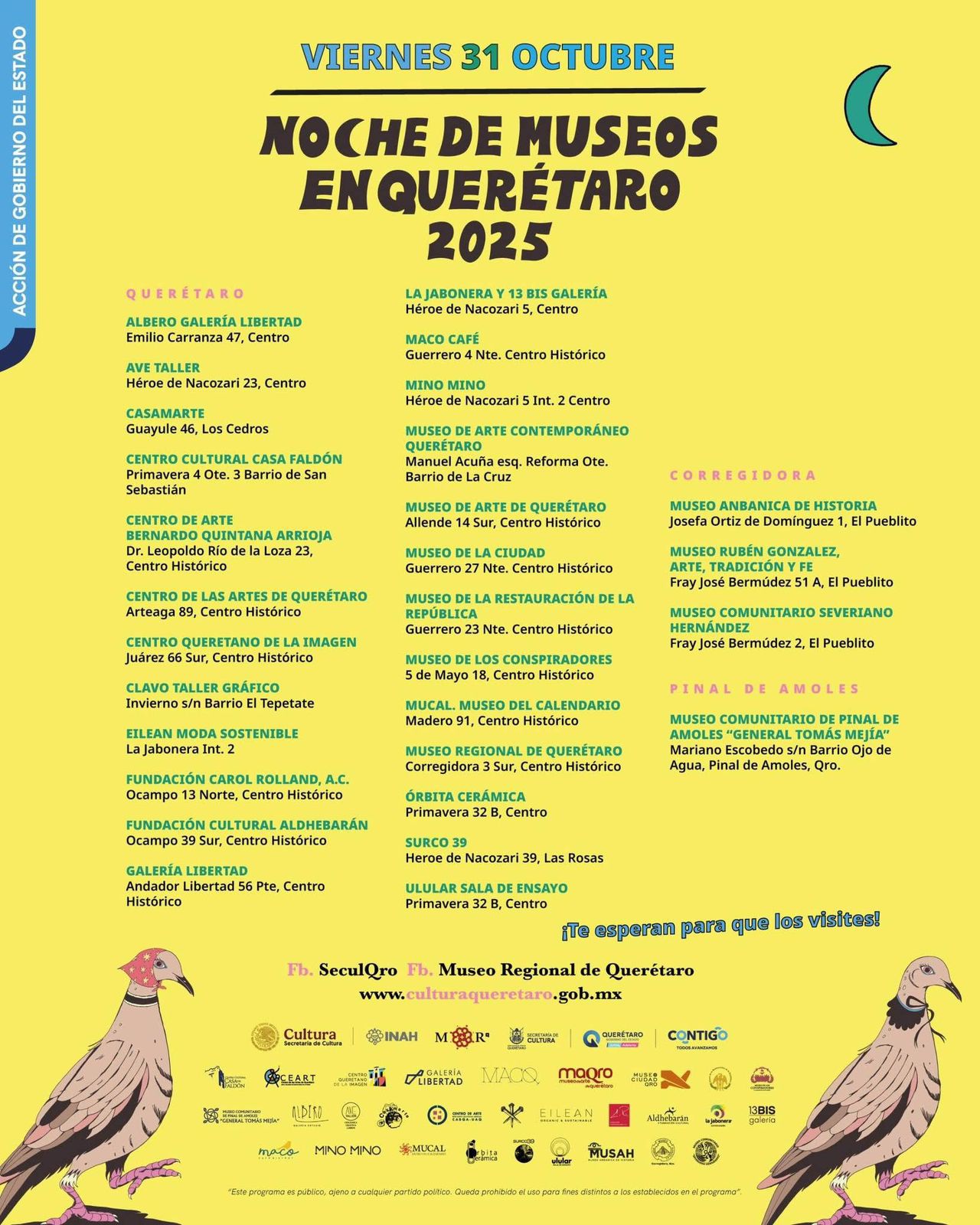 Algunos recintos, como el Museo Regional de Querétaro y los espacios de la Secretaría de Cultura del Estado, permanecerán abiertos hasta las 10 de la noche.
