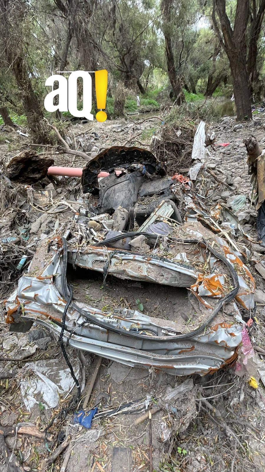 Se trata de un vehículo color gris, al parecer marca Nissan de modelo reciente, con carrocería automática, la cual quedó destruida tras ser golpeada por troncos y otros objetos dentro del canal.