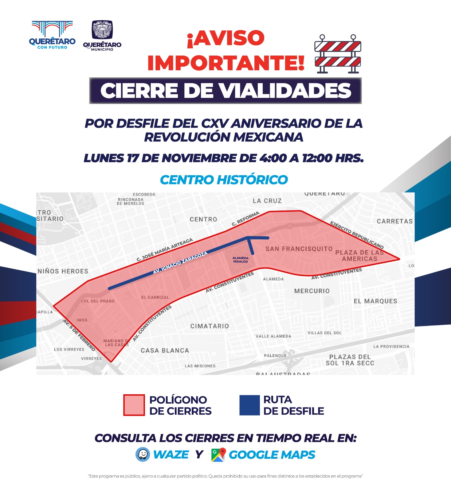 En el caso de los cierres viales desde tecnológico a La Alameda se realizarán a partir de las 7 de la mañana y conforme avance en desfile se irán abriendo las calles.