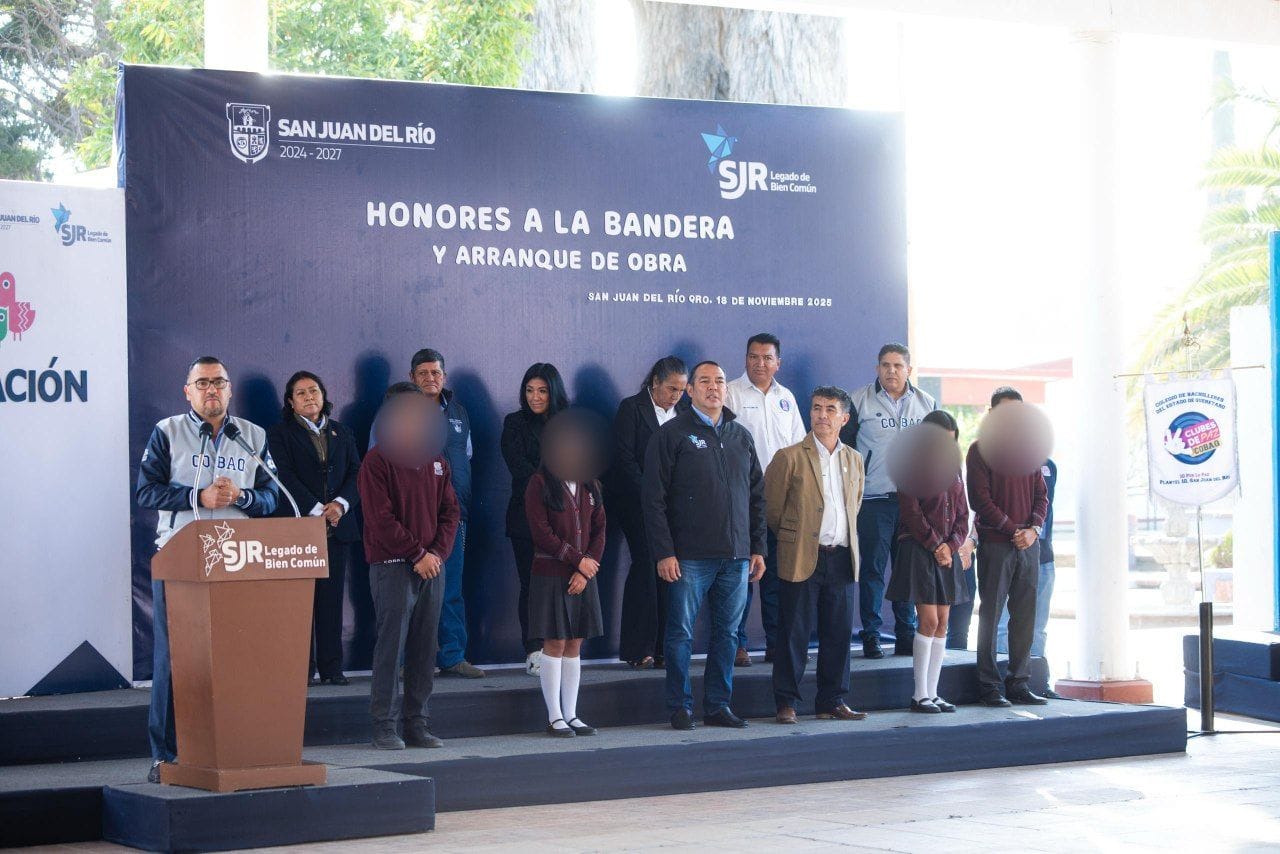 Durante la ceremonia de honores a la Bandera e inicio de la obra —en la que estuvo presente el director general del Colegio de Bachilleres del Estado de Querétaro (COBAQ), León Enrique Bolaño Mendoza)— el presidente municipal de San Juan del Río, Roberto Cabrera Valencia, destacó que, a través de estas acciones, se fortalece la educación.