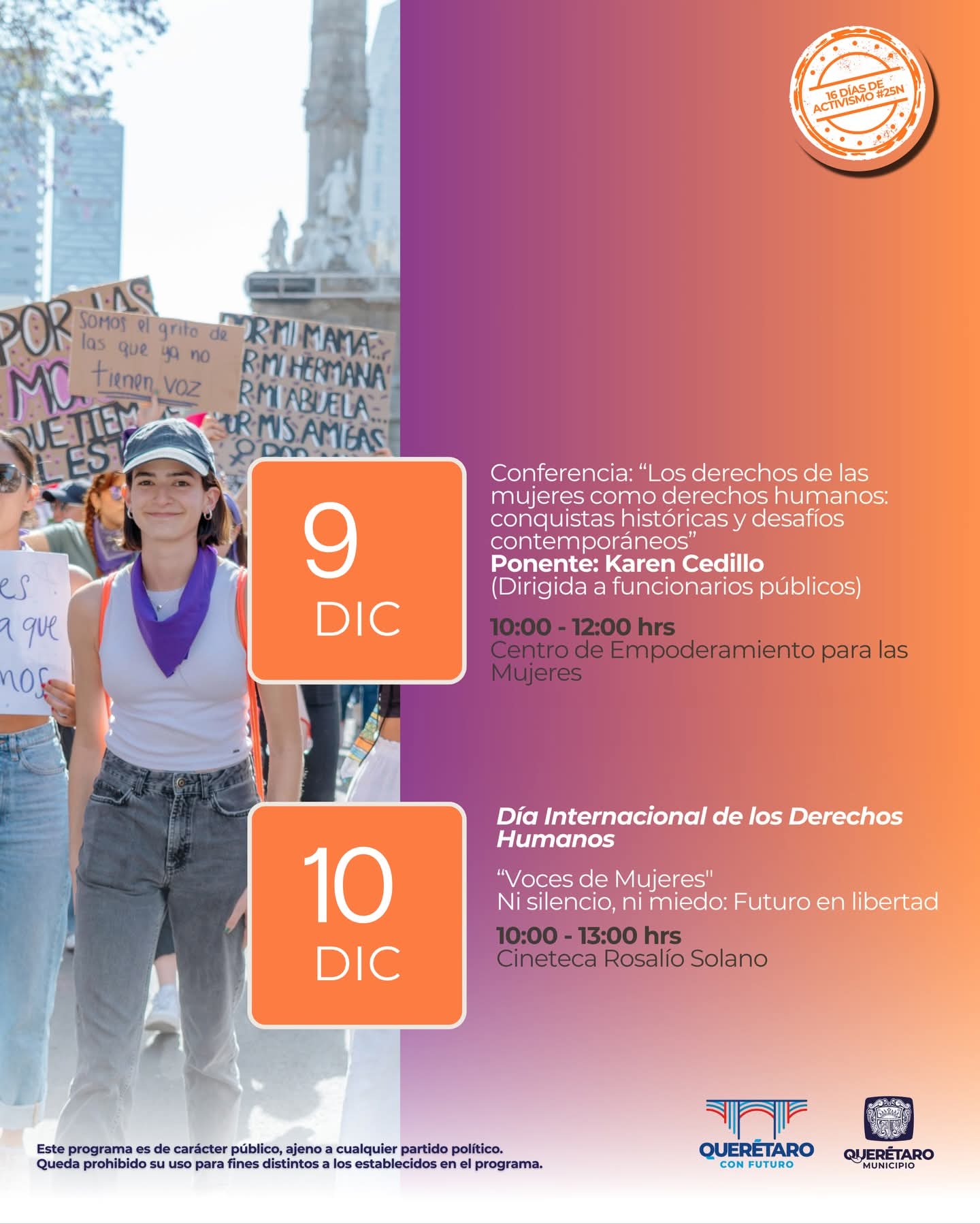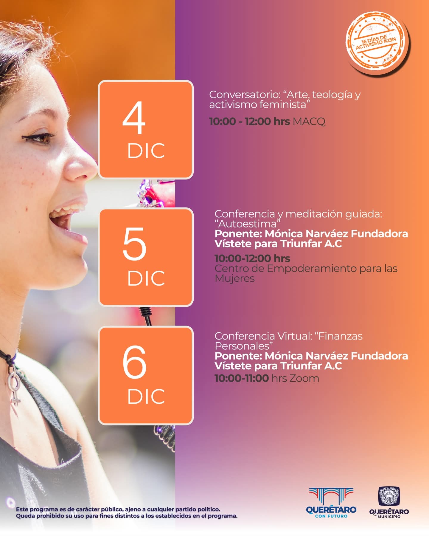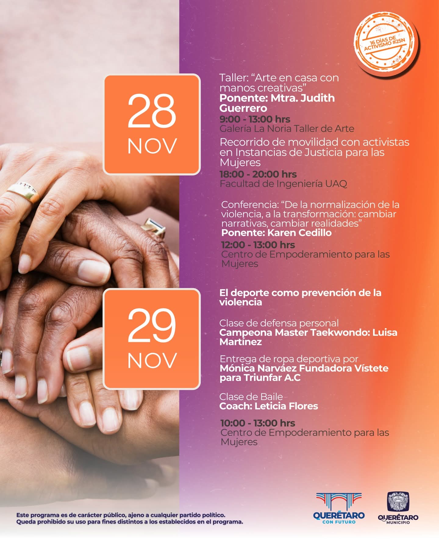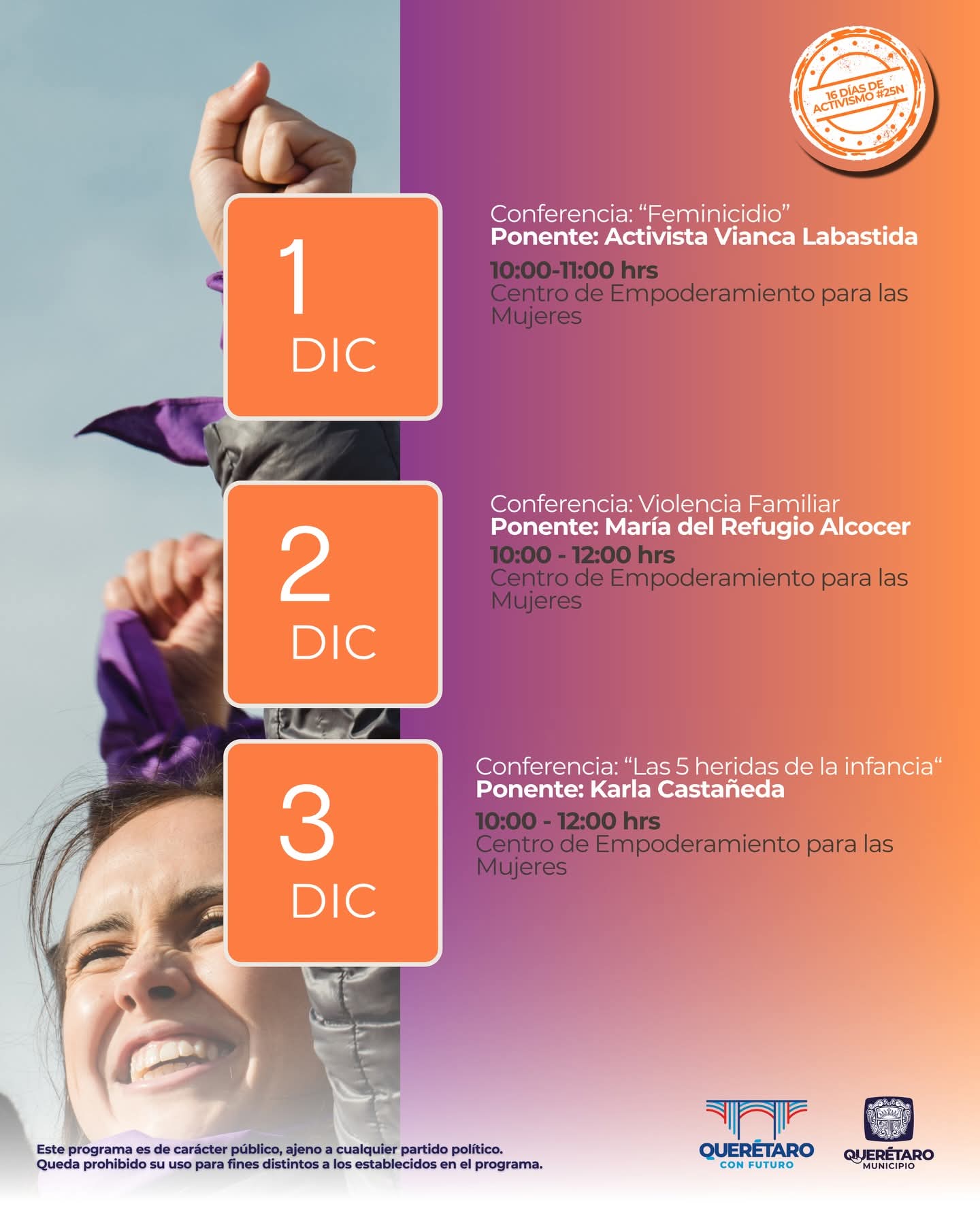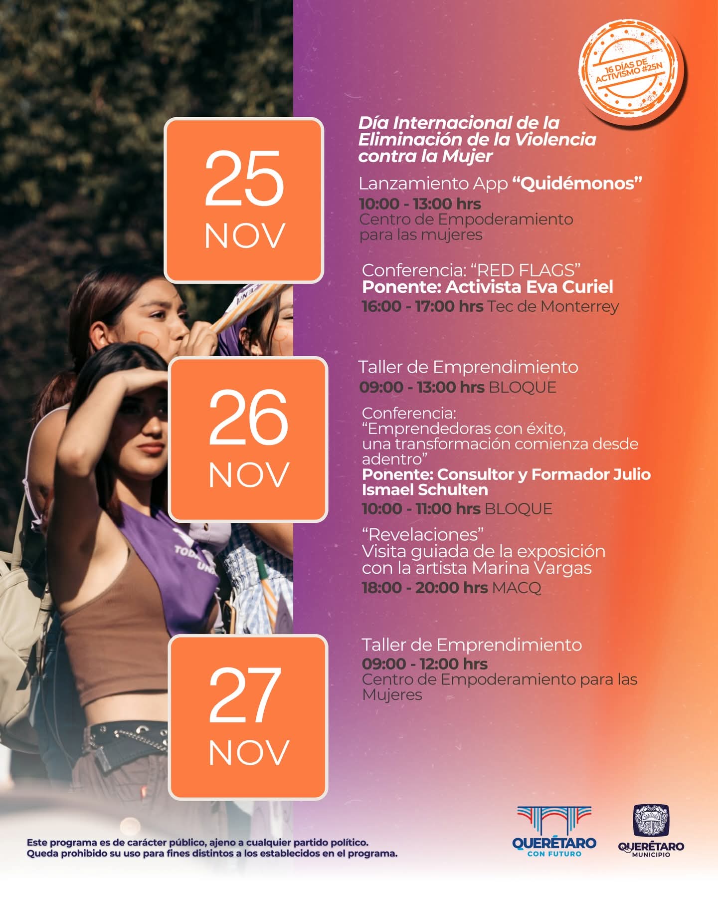 Además, en torno al Día Internacional de la Eliminación de la Violencia contra la Mujer, el municipio de Querétaro organizará 16 días de actividades en torno a la erradicación de estas prácticas, con charlas, conversatorios, talleres, entre otras.