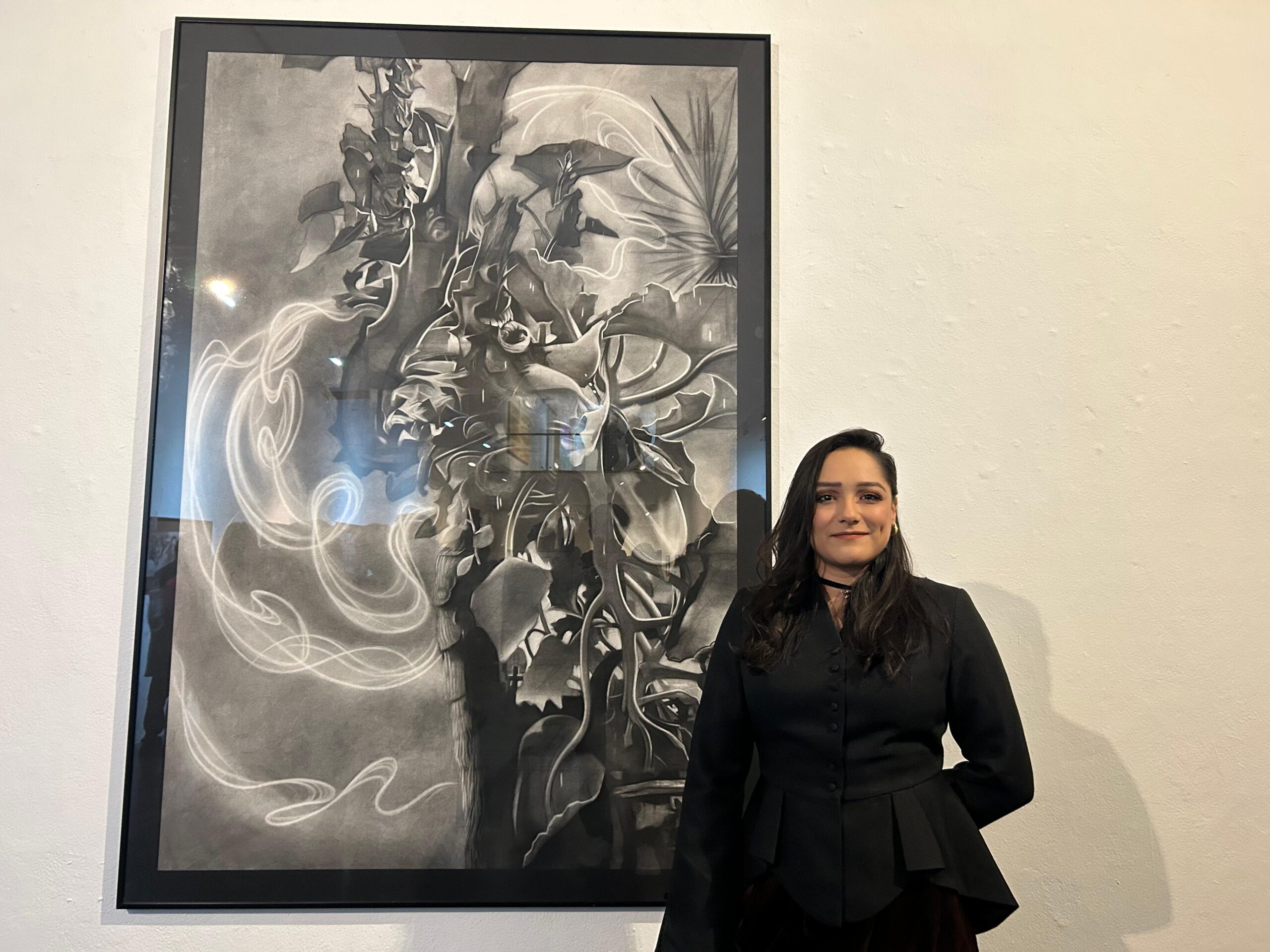 La artista señala que su exposición en la Galería Libertad, que cuenta con 35 obras de dibujos de gran formato hechos con carboncillo sobre papel, narra su visión de los ciclos de la vida y la muerte.