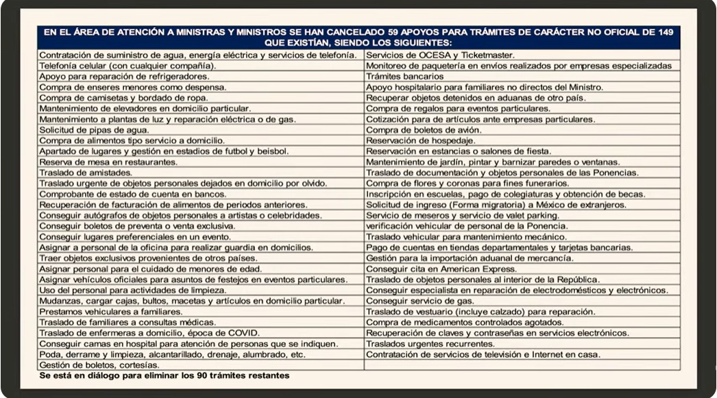 Asimismo, la mandataria exhibió una larga lista de 59 trámites extraordinarios para ministros que se cancelaron, tal como apoyos para reparar refrigeradores, compra de despensa, pipas de agua, gestión de lugares en estadios, reservas de mesas en restaurantes, así como conseguir autógrafos y objetos personales de celebridades, asignar a personal para guardias en domicilios, acciones de limpieza y cuidado de menores de edad.