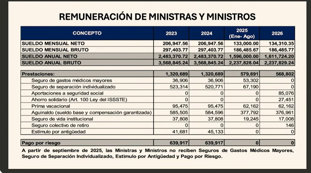 La tabla comparativa mostró los ingresos percibidos por los ministros en 2023, 2024, así como los montos correspondientes a 2025 y 2026, mostrando una disminución en el total anual a partir de la nueva conformación del Poder Judicial.