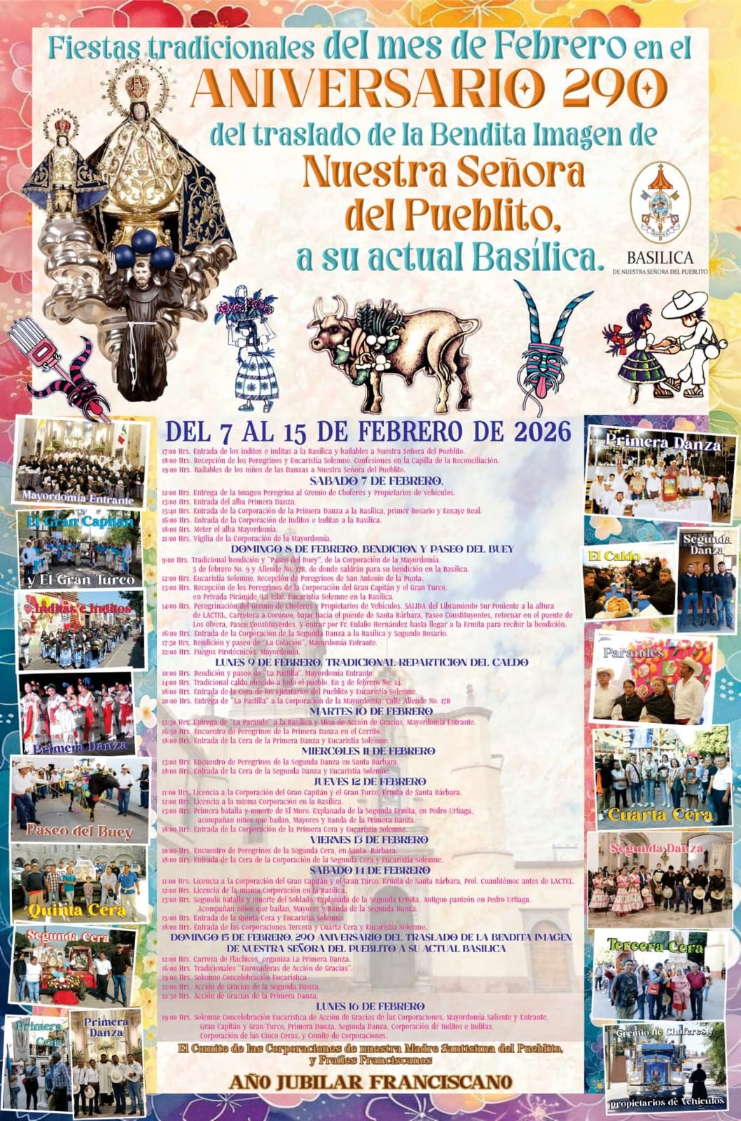 El lunes 9 de febrero será el tradicional caldo de buey ofrecido a todo el pueblo a las 2 pm en 5 de febrero #24. Para el 10 de febrero, continuarán las actividades con entrada de danzas y peregrinos en la Basílica desde las 12:30 pm hasta las 6 pm.