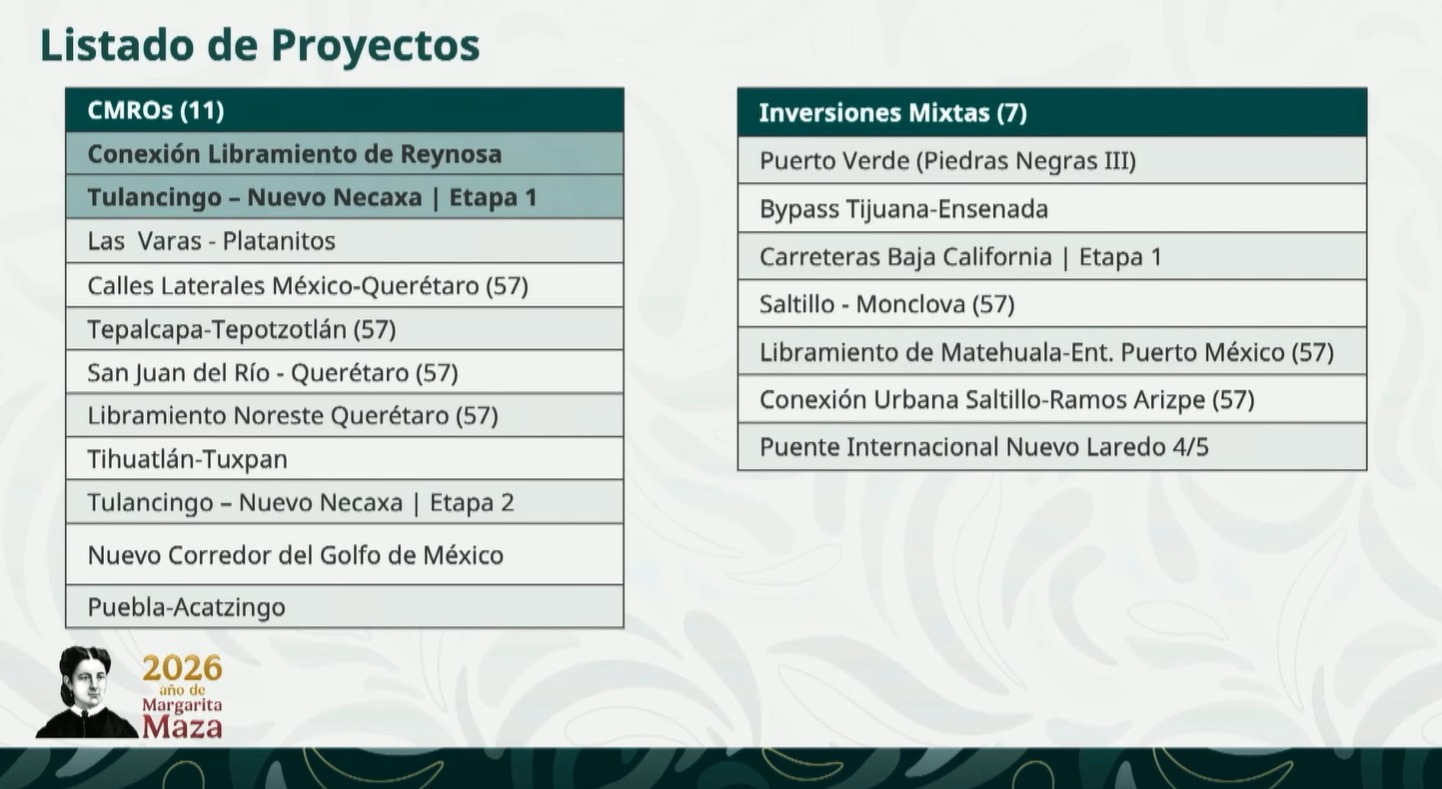 El funcionario federal explicó que, del total de proyectos, 11 se realizarán a través de los CMROs (Construcción, Mantenimiento, Rehabilitación y Operación) y 7 a través de inversiones mixtas.