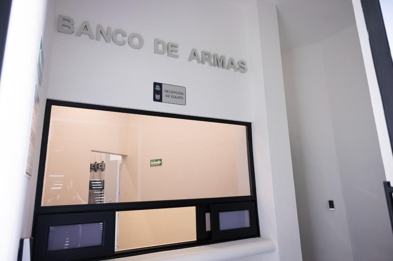 La coordinadora general de la Comisión Estatal de Infraestructura (CEI), Sonia Carrillo Rosillo, señaló que el banco de armas funciona prácticamente como un búnker, cuenta con un área destinada a equipo de protección personal, zona de armería, control de acceso biométrico y acceso vehicular.