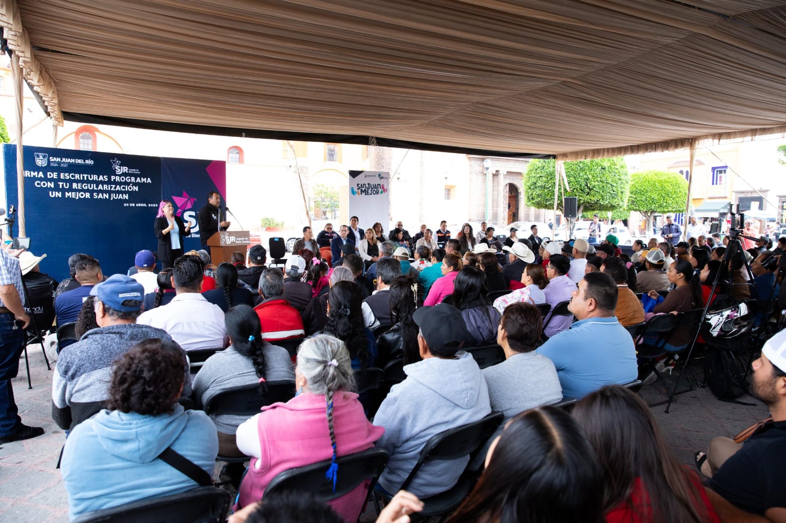 El presidente municipal de San Juan del Río, Roberto Cabrera Valencia, encabezó la firma de escrituras del programa “Con Tu Regularización Un Mejor San Juan” en la Plaza Independencia, donde 146 escrituras públicas fueron firmadas.