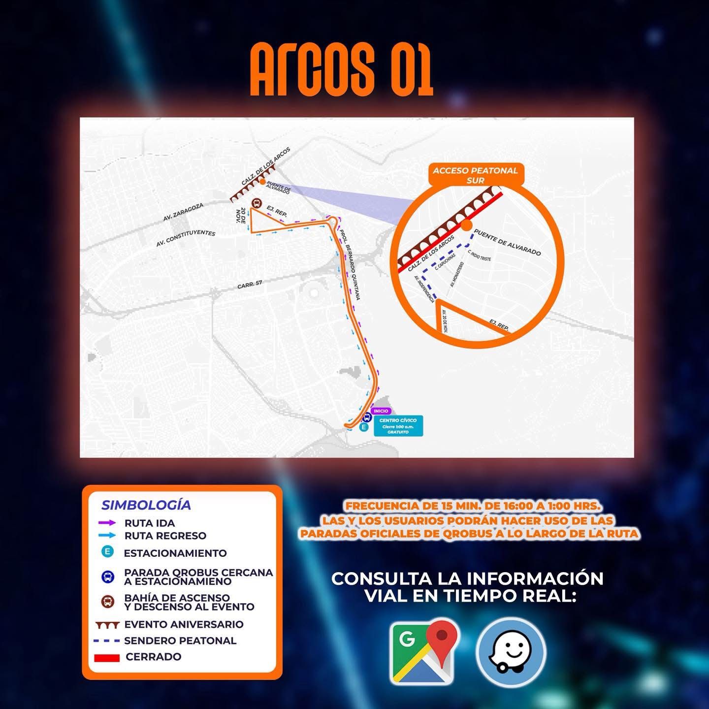 La primera llamada, Arcos 1, arrancará en el Centro Cívico, donde hay un estacionamiento gratuito que cierra hasta la 1 de la mañana; pasará por prolongación Bernardo Quintana hasta llegar a la esquina de Ejército Republicano y 20 de Noviembre, donde inicia su regreso a la zona de Centro Sur; tendrá una frecuencia de 15 minutos.